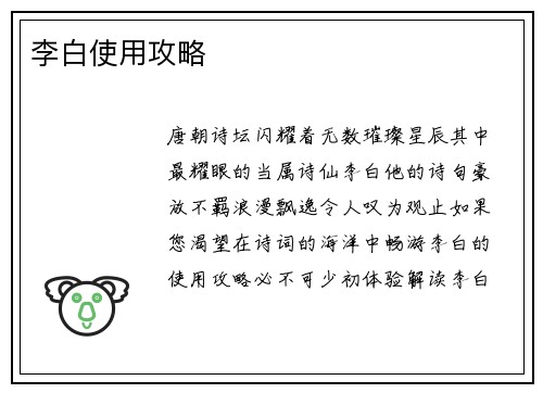 唐朝诗坛闪耀着无数璀璨星辰,其中最耀眼的当属诗仙李白。他的诗句豪放不羁,浪漫飘逸,令人叹为观止。如果您渴望在诗词的海洋中畅游,李白的使用攻略必不可少。 初体验:解读李白诗歌的密钥 李白诗歌中最鲜明的特点便是其奇崛的想象力和丰富的比喻。在阅读时,切勿拘泥于字面意思,而要深入探寻诗句背后的深意。例如,在...