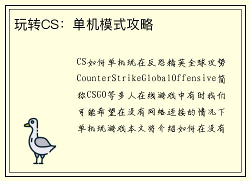 CS如何单机玩 在《反恐精英:全球攻势》(Counter-Strike: Global Offensive,简称CS:GO)等多人在线游戏中,有时我们可能希望在没有网络连接的情况下单机玩游戏。本文将介绍如何在没有网络连接的情况下单机玩CS:GO,并提供一些有趣的单机游戏模式和地图。 1. 单机游戏模...